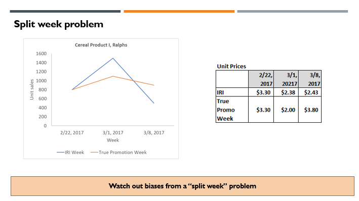 We call this data aggregation bias problem a “split week” problem since the real promotion week data are artificially split into two database weeks. Figure 1 above shows actual sanitized data in the cereal product category at Ralphs chain in Southern California. We compare IRI unit sales and price data (i.e., misaligned data) with promotion week aligned data (which is a proxy of properly aggregated data from Kroger: 84.51: We have created proxies for both by using household panel data for this example since Kroger 84.51 data are not accessible for research. However, this is based on multiple consulting project experiences.) With the blending of promotion week data with non-promotion week data, promotion peak volume is understated in IRI data. In contrast, off-promotion sales (a week following the promotion week) are overstated in IRI data. Net prices are overstated during the promotion week and understated in non-promotion week in IRI data. These patterns usually lead to underestimation of promotion ROI and downward biases in price elasticities. Even more, the net prices from IRI or AC Nielsen data do not correspond well to actual regular prices or promotion prices in the accounts with a “split week” problem, as shown in Figure 1.